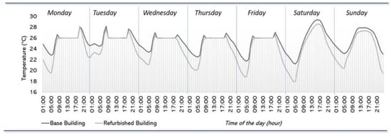 Many studies are focused on the improvement of building efficiency and passive solutions are gaining more and more priority. Gil-Baez et al. [] enhanced the sustainability of a school in the Mediterranean climate, through the passive solution for the building envelope. They analyzed technologies like internal and external insulation, external vented façade, internal cavity insulation and external prefabricated façade for the opaque envelope and solar screens and low emissivity glazing for the transparent envelope. They combined a set of measures on the building: solar window protection, external canopy, a screen of trees, external Thermal Insulation Composition System, low-emissivity glazing, external roof insulation, and a removable textile canopy. The results of this combination showed a 15.9% reduction of energy consumption for cooling, without compromising the functionality and accessibility of the building.