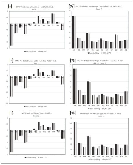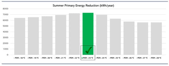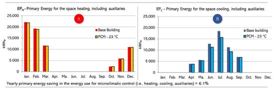 The results show a considerable reduction of energy consumption when the melting point of the PCM is 23 °C and growing energy demand when the PCM melting point increases or decreases. The advantages of the PCM building integration occur when the material changes its phase from solid to liquid and vice versa, in order to collect heat, subtracting it to the ambient and releasing it during the solidifying phase. When the PCM melting point is too low (18 °C–20 °C) the material will be melted all the time, instead, when it’s too high the PCM will be predominately solid (25 °C–28 °C). For these reasons, the best PCM, in our case study, is the one with a melting temperature of 23 °C and a freezing temperature of 21 °C. Of course, these outcomes are the ones that maximize the cooling energy savings with reference to our peculiar case study, characterized by well-defined constructive technologies, building use, location and specific other boundary conditions.