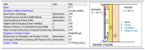 Benefits can be achieved in both the seasons of heating and cooling, because, in winter, the thermal insulation is dry, not affected by rainfall, so that the thermal conductivity does not rise because of water and humidity. Besides the ventilation, the external cavity allows also a better preservation of the wall. In summer, conversely, the ventilation of the cavity, powered by the solar radiation on the baffle, allows the stack effect with a consequent heat dissipation and a lower cooling load of the building. With reference to the educational building of Termoli, the vented façade was added to the present wall. The vented coating was modeled in the software EnergyPlus, through the natural vented cavity and the gap convective radiation as other side conditions model, with input data are reported in Figure 17.