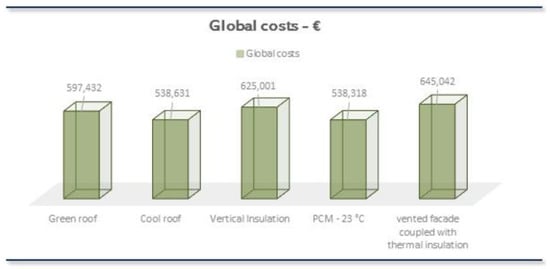 As can be seen from Table 8 and Figure 18, the intervention with the highest overall global cost is the vented façade and is equal to 645,042 €. Conversely, the global cost of PCM intervention is the lowest (538,318 €).