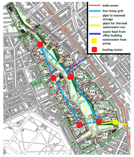 Figure 3, the case study site is again displayed including the intended positioning of the heating centers and the anergy grid (both light blue), the pipe from the adjacent cooled office building (dark blue), the wastewater heat exchanger in the southeast (red), and the pipes from/to the geothermal boreholes (brown). Colours of buildings indicate their planned height (the darker the higher).