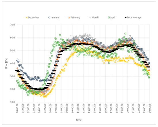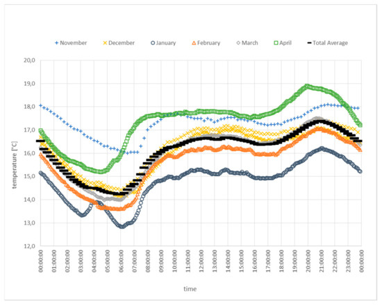 The average diurnal temperature patterns show a minimum slightly above 14 °C, a maximum of slightly above 17 °C, and an average temperature of around 16 °C. This value is even higher than the one measured at the WWTP and used for the rough analysis and thus highlights the importance of on-site measurements for more appropriate estimations of the available heat recovery potential. Anyway, for detailed planning purposes, these data are being considered a basic prerequisite.