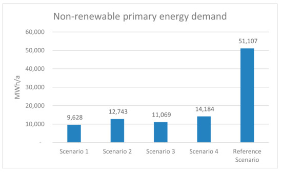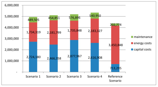 All of the four scenarios include (1) solar energy in the form of PVT collectors respectively PV collectors, (2) wastewater heat, (2) ambient air heat in a quantity that balances the annual heat consumption together with the fixed amounts from the other sources as well, (4) waste heat from surrounding offices, and (5) geothermal boreholes for storing thermal energy. The scenarios differ concerning the dimensioning of heat pumps in the five heating stations between the low-temperature grid and the five local heat grids. Either they were dimensioned to the lowest expectable temperature in Vienna which is defined to be minus 12 °C expressed in a 2-day mean value, or the threshold was 0 °C (below this, gas heating boilers would cover a part of the heat load). As reference scenario, in order to compare the environmental and economic effects, a standard gas-condensing boiler with minimum solar thermal collector contribution according to the Viennese building law (1 m
