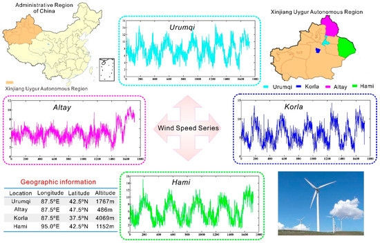 The daily average wind-speed data is collected from four observation sites of the Xinjiang Uygur Autonomous Region located in northwestern China, including Urumqi City, Korla City, Altay Region and Hami Region. The sample period covers more than four years, from 1 January 2009 to 18 September 2013. The original wind-speed time series of the four observation sites are plotted in Figure 2 together with detailed geographic information.
