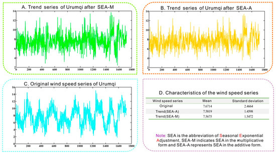 Next we take Urumqi as the representative example to demonstrate the presented hybrid forecasting methods step by step with intermediary outcomes. In Figure 3, the number of the day without unit is in the horizontal axis, and the vertical axis is the wind speed with unit m/s. As illustrated in Figure 3, the trend series obtained from multiplicative and additive seasonal exponential adjustment are depicted respectively in Figure 3 part A and Figure 3 part B in contrast with the original wind-speed series of Urumqi. In addition, mean values and standard deviations of the above three wind-speed time series are calculated as listed in the table of Figure 3 part D. The vivid line charts and computed results indicate that the seasonal exponential adjustment technique contributes to eliminating periodic fluctuations and lowering standard deviations. That is to say, the trend series are to some extent easier to forecast than the original series.
