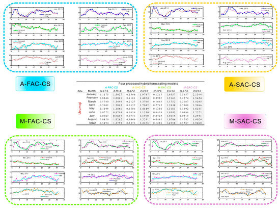 Table 1 lists the forecasting errors of the four kinds of hybrid models, namely A-FAC-CS, A-SAC-CS, M-FAC-CS and M-SAC-CS, from January to August 2013 with respect to four targeted wind-speed observation sites, including Urumqi, Altay, Korla as well as Hami. Moreover, for each observation site, the average MAPE and RMSE values of the eight months are also calculated for each of the presented hybrid forecasting models to reflect and evaluate the overall forecasting performance.