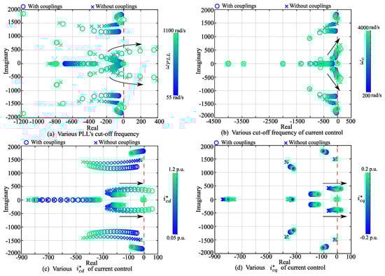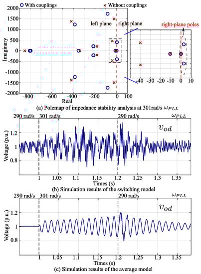 Figure 4a under the 301-rad/s cut-off frequency of the PLL. The right-plane poles appear when the couplings are considered. On the contrary, if the couplings were ignored, the analysis shows that the system was stable because all its poles still stayed in the left plane. The stability analysis results of both impedance stability analyses were mismatched.
