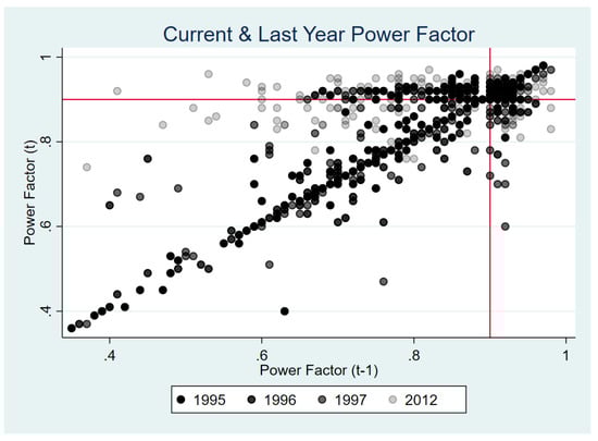 Figure 1 illustrates the power factor of firms in time t compared with time t-1. Horizontal and vertical lines at 0.9 of the X and Y axis represent the cut-off threshold of the power factor improvement policy. Points that fall to the right of the vertical line and above the horizontal line represent power-efficient firms that were not subject to the penalty under the policy. From Figure 1, we find those firms scattered along the 45 degree line did not improve their power factors from the previous years. Those above the 45 degree line are the compliers who responded to the policy and improved their power factor compared with that at time t-1. There are a number of firms to the left of the vertical line who are just above the horizontal line: these are the firms who have improved their power factor above the penalty threshold from the previous year. In turn, those scattered below the 45 degree line are the noncomplying firms.