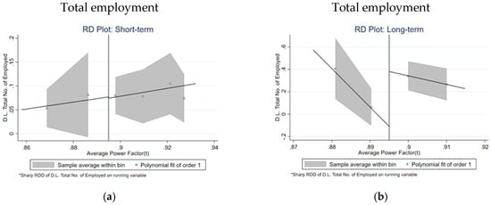 The shaded region shows the 95% confidence interval. Overlapping of the shaded regions in the left and right sides of the diagram indicates no significant difference between the potential treatment and control groups. For instance, in Figure 2, only long-term salary for all staff, management staff, and non-management staff are significantly different. The significant difference in reduced-form estimation for potential treatment and control groups is important, as we divide this by the average treatment effect (ATE) of power factor correction policy on the probability of power factor improvement, in order to obtain our FRD estimates. (Similar to Figure 2, we also plot the results of subsample analyses, namely that for low- and medium-voltage firms separately from high-voltage firms in both short and long term, which can be found in Appendix A).