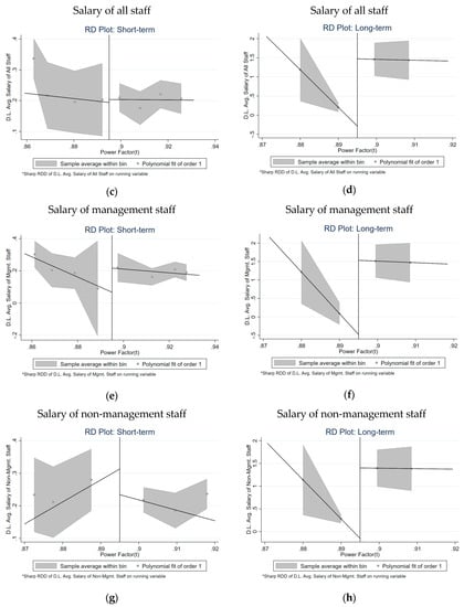 Subsample SLT—Low- and Medium-Voltage Firms Sharp RD result of average treatment effect of the penalty policy on the outcome at the threshold, . Short-term and long-term RD plots for total employment are shown in (a,b), respectively. Similarly, RD plots for all staffs for short and long run are represented in (c,d), accordingly. In addition, (e,f) show the short-run and long-run RD plots of management staffs’ salary, respectively. Finally, (g,h) represent short- and long-run RD plots of non-management staffs’ salary, accordingly.