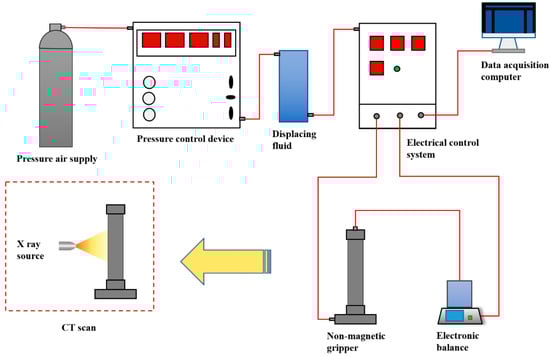 Considering the properties of the small and non-diagenetic particles of the clayey-silt reservoir, equipment was developed to simultaneously perform sample seepage and CT scan experiments. The equipment group mainly consisted of a pressure air supply, a pressure control device, an electrical control system, a non-magnetic gripper, an electronic balance, a data acquisition computer, and a micro-CT scan system (Figure 2). The non-magnetic gripper was made of polyimide so that the sample seepage experiments could be carried out with a large pressure while ensuring the resolution of the CT scan. The pressure air supply and the pressure control device were responsible for adjusting the fluid pressure. The electrical control system was used to record the inlet-outlet pressure of the non-magnetic gripper and the electronic balance reading, and automatically store data in the data acquisition computer. The electronic balance was used to record fluid mass at the outlet of non-magnetic gripper in real time and obtain the fluid flow rate. Hence the sample permeability at each time point in the experiment could be calculated by Darcy’s law. The Sanying Micro-CT scan system includes an X-ray CT scanner and a data processing reconstruction system, which can obtain 3D micro-structure of the samples with the best pixel resolution of 650 nm.