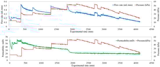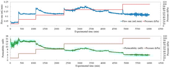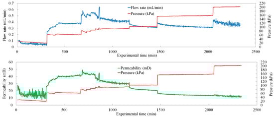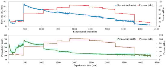 Figure 9 shows the flow rate and permeability versus pressure change of the fourth set of seepage experiments under a stepwise pressurization working system. The permeability started at about 16 mD and decreased to reach a range of extremely low value (<10 mD) with the increased pressure difference. However, the law of permeability change under different pressure gradient of the fourth sample did not change. When the pressure difference was less than or equal to 30 kPa, the permeability increased and stabilized at a large value. When the pressure difference was more than 30 kPa, the permeability decreased continuously as the pressure difference increased. This result also further proves that the permeability of the clayey-silt reservoir may remain relatively stable when the pressure gradient does not exceed 3 MPa per meter; when the pressure gradient is greater than 3 MPa per meter, the permeability will rapidly decrease.