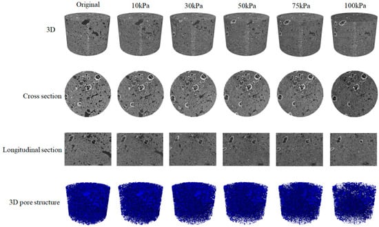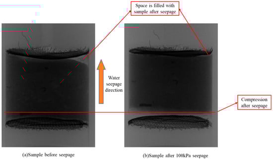 Seepage experiments on the fourth sample set (plunger length 10 mm) were performed with CT scan. According to the experimental procedure illustrated in Figure 4, six CT scans were performed during the fourth seepage experiment. Figure 8a,b show CT projections of the sample before seepage and after 100 kPa seepage, respectively. After a series of variable pressure seepage experiments, the overall structure of the reservoir sample was compressed, and the part not filled by sample before the experiment was also filled after the experiment, indicating that the clayey-silt reservoir has structure compression under a large pressure difference.