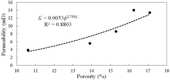 The relationship between the porosity and permeability of the fourth sample is presented in Figure 11. It is clear that the permeability K increases with the power of porosity . The following power law equation provided a very good fit (R2 = 0.8803) to this relationship: