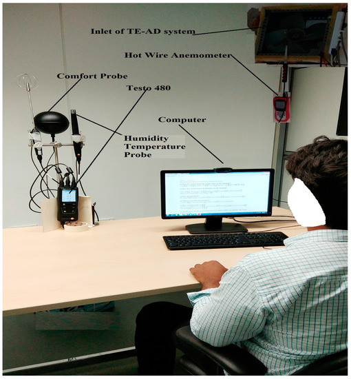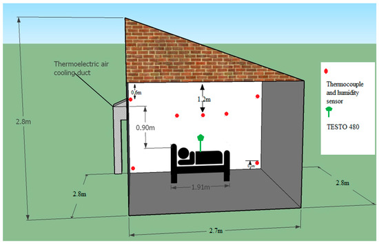 A test chamber of volume 21.16 m3, situated in the research facility of Universiti Teknologi PETRONAS, Perak, Malaysia was utilized for this experiment. The measured volume of the study test chamber was 21.16 m3. The north-side enclosure of the test room was fitted with a thermoelectric air channel cooling framework (TE-AD) with adjustable power capacity starting from 240 W to 840 W. The components of the TE-AD framework was set up as specified in a previous study [27]. The test chamber comprised of a bed of measurement (0.91 m × 1.88 m), a wooden chair, a general-use table of measurement (1.2 m × 0.49 m × 0.77 m). A LED bulb (20 W, 1600 lm), and a roof fan of specifications (54 W, 330 rpm, and 200 cm3/min) were pre-fitted in the room.
