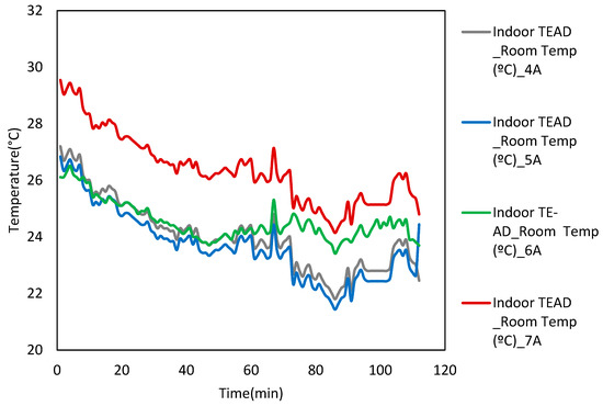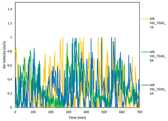 Experimental data were recorded at varying operating powers to the thermoelectric cooling system starting with 240 W up to 840 W, as described in the methodology. Variations in outdoors, indoors, center-of-bed temperature, as also relative humidity were recorded (Figure 3, Figure 4, Figure 5 and Figure 6). Variations in the air flow velocity inside the test room are shown in Figure 7. Data obtained at 240 W were ignored as they did not provide significant changes in the indoor climatic conditions. To assess the difference between the mean scores of indoor temperatures obtained at operating power of 360 W and 480 W, a two-sample t-test was performed. The test statistics show a significant difference in the indoor temperature between 360 W and 480 W operating powers at 95% of confidence interval (t = 6, df = 111). The mean decrease in the indoor temperature from 480 W to 600 W was 0.389 °C, as shown in Figure 3. Indoor temperature data at operating power levels of 480 W was analyzed similarly, resulting in test statistics of (t = 1.28, df = 111), and a mean decrease in indoor temperature of 0.69 °C. Further increments in the operating power to TE-AD system, i.e., from 600 W to 720 W, significantly reduced the indoor temperature to (M = 24.27 +/− 1.14 °C). A comparison of temperatures at these two power levels from two-sample t-tests indicated (t = 2.26, df = 111) a mean decrease in the indoor temperature from 600 W to 720 W of 0.559 °C. Optimum performance in terms of temperature reduction was achieved at 720 W, and the mean indoor temperature achieved was (M = 23.72 +/− 0.97 °C). A comparison of temperatures obtained at 720 W and 840 W from two-tailed t-tests indicated (t = −1.176, df = 111) with a mean increase in the indoor temperature from 720 W to 840 W of 1.98 °C. ANOVA test was employed to estimate the difference between indoor temperatures at variable input currents and results show a significant change in the indoor temperature of the test chamber at variable power supplies with p value 0.000146 and F calculated value of 4.11.
