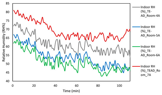 Variations in temperature and relative humidity near the mid-point of the bed are shown in Figure 5 and Figure 6. In order to reduce redundancy in the graph, the variation of 480 W to 840 W is shown in Figure 5 and Figure 6. To see the statistically significant variations of temperature and relative humidity at operating power of 360 W and 480 W, a paired-sample t-test was utilized. The decrease in temperature and relative humidity was statistically significant when compared between operating power levels of 360 W (M = 26.22 +/− 0.75 °C, M = 68.21 +/− 2.31%) and 480 W (M = 25.65 +/− 0.75 °C, M = 64.24 +/− 3.21). The mean reduction in temperature and relative humidity were 0.57 °C and 3.77%, as shown in Figure 5 and Figure 6. By raising the TE-AD apparatus power input to 600 W, the mean temperature and relative humidity decreased to (M = 25.23 +/− 0.82 °C, M = 60.31 +/− 1.53).