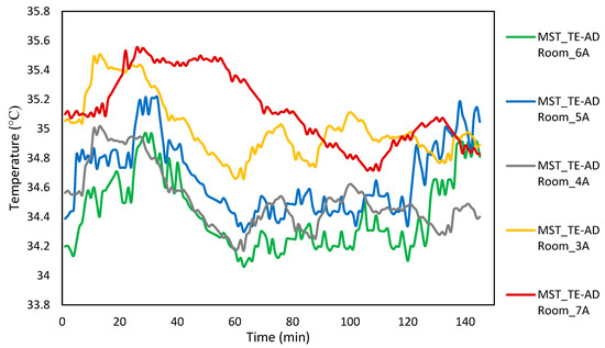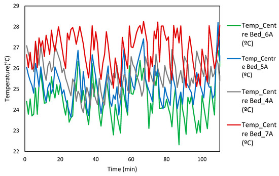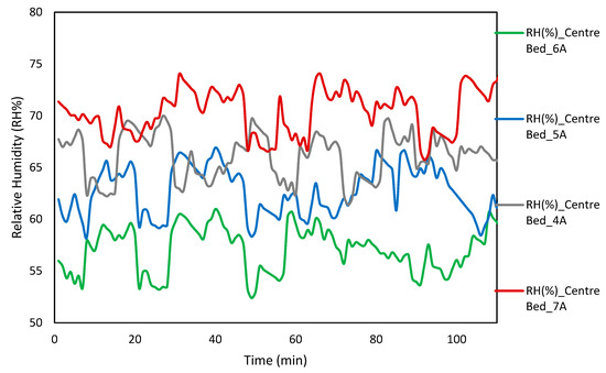 A further increment in the operating power input to the TE-AD system to 720 W decreased the temperature and relative humidity recorded close to the center of the bed by (M = 24.49 +/− 0.94 °C, M = 55.48 +/− 3.23). The temperature and relative humidity showed a rise when the operating power to the TE-AD system was raised from 720 W to 840 W, and the mean value increased to (M = 26.49 +/− 1.12 °C, M = 68.731 +/− 4.021).