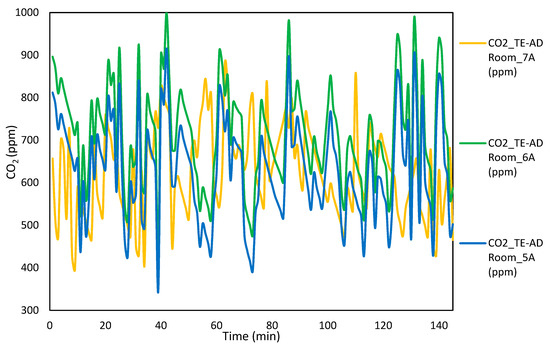 The variations in CO2 generated inside the test room at different operating powers to the TE-AD apparatus are shown in Figure 9. A paired-sample t-test was utilized to assess the difference in the mean scores of CO2 generation at operating power 360 W and 480 W and values of (t = −3.5, df = 144) at a 95% level of significance were obtained. This shows that the CO2 increases with an increase in the input current. There was an increase in the indoor CO2 content at an operating power of 480 W (M = 621.52) as compared to an operating power of 600 W (M = 654.32) which was found to be statistically significant. The t-test statistics was found as (t = 2.64, df = 144). The cooling effect produced by the TE-AD system increased by raising the operating power to the TE-AD system from 600 W to 720 W (M = 673.42), and the concentration of CO2 increased to (M = 713.43). Further increments in the operating power to the TE-AD system to 840 W significantly reduced the CO2 content inside the room to (M = 621.64). The TE-AD framework has turned out to be a standout among the most reliable and naturally well-disposed sustainable power source advancements, which assume a critical job in carbon dioxide emission mitigation. Analysis was performed to calculate the measure of CO2 discharge moderated because of the current TE-AD framework when contrasted with ordinary cooling frameworks. The thermal power plant in Malaysia powered by coal discharges an average of 1.21 kg/kWh CO2 [35]. Therefore, total CO2 mitigation from existing TE-AD system was calculated for 1 year and compared with normal air-conditioning system by using Equation (6) as follows [36]: