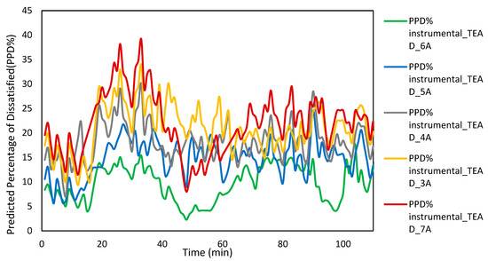 The variations in the instrumental Predicted Mean Vote (PMV) and Predicted Percentage of Dissatisfied (PPD) ratings at different operating powers supplied to the TE-AD apparatus are shown in Figure 11 and Figure 12. For analysis of variations in PMV and PPD at operating power of 360 W and 480 W, a two-sample t-test was conducted. A significant shift in the PMV and PPD ratings at operating power of 360 W (1.23 +/− 0.42, M = 24.31+/− 4.87) to operating power of 480 W (M = 0.84 +/− 0.32, M = 19.46 +/− 3.82) was observed. The t-test values (t = 27.1, df = 111) and a 95% confidence interval. The mean shifts in the PMV and PPD ratings were 0.39 and 4.85% with a 95% confidence interval, as shown in Figure 11 and Figure 12. An increment in the operating power to the TE-AD apparatus to 600 W shifted the PMV rating toward a neutral rating (M = 0.45+/− 0.48) and decreased the percentage of dissatisfied occupants to (M = 15.67+/− 5.34).