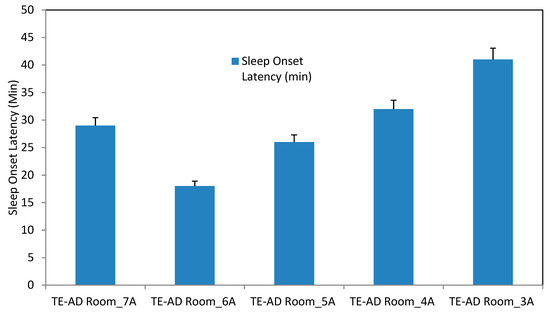 Sleep onset latency variations at different operating power to the TE-AD system are shown in Figure 13. Comparison of data obtained at an input current of 360 W and 480 W by employing a paired-sample t-test shows significant variations in sleep onset latency (the t = 3.56). The mean sleep onset latency (SOL) time decreased from (M = 40.7 +/− 0.98 min) to (M = 32.2 +/− 1.02 min) by raising the operating power from 360 W to 480 W. The sleep onset latency time further decreased to (M = 26.45 +/− 1.12 min) when the TE-AD system was functioned at 600 W. A maximum reduction in sleep onset latency was recorded when the system was functioned at 720 W, and the mean time decreased to (M = 18.33 +/− 1.18 min). A further increment in the operating power input to the TE-AD apparatus increased the sleep onset latency time to (M = 29.52 +/− 1.35 min).