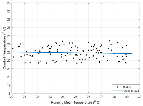 The adaptive comfort model of the test room used in this study is determined by linear regression. Using Griffiths method, the dependent variable Tcomfort and an independent variable T can be calculated by using Equation (4).