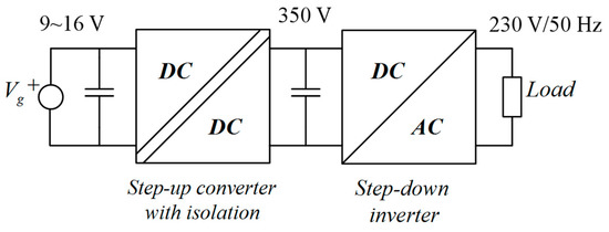 Many different two-stage microinverter topologies have been proposed in order to provide a large AC voltage (230 Vrms, 50 Hz) from a low DC supply in the range of 9 to 16 V [3,4,5].