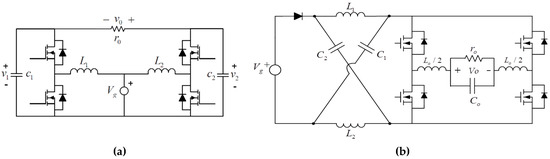 Since there is growing interest in developing transformerless alternatives [3], several single-stage approaches have been proposed. Among the most reported configurations are the boost inverter (also named Barbi) [8,9,10], shown in Figure 3a, and the Z-source inverter [8], in Figure 3b. Although these last approaches avoid the use of a transformer, they exhibit a high nonlinear behavior and offer a very limited gain conversion ratio (typically below 10), and a poor efficiency [5,6,7,8,9,10,11,12], resulting in non-competitive solutions. This is especially important, in the Z-source inverter, where the shoot-through states management complicates the converter control, and the high-stress of the switching devices reduces the efficiency.
