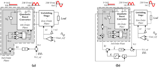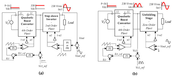 According to Figure 4, no matter what the selected strategy is, “slow-fast” or “fast-slow”, the first stage is always a quadratic boost converter, and consequently, a fourth order plant. Nevertheless, in the “slow-fast” strategy, the second stage is a buck inverter, and has a second order dynamics; whereas in the “fast-slow” approach, the full-bridge is an unfolding stage, lacks an output filter, and has zero-order dynamics. Figure 5 compares both microinverter operation strategies.
