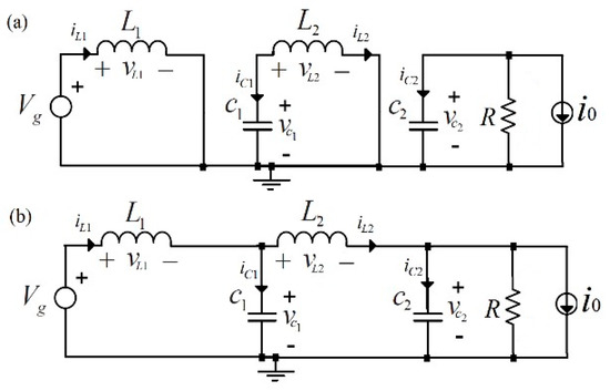 Only the quadratic boost stage is analyzed due to the zero dynamics of the unfolding stage. The fast stage is a fourth-order variable structure system with its two commutation cells in synchronous operation. Continuous conduction mode (CCM) operation was assumed. As shown in Figure 7, this converter has two equivalent circuit configurations for CCM operation during a switching period.