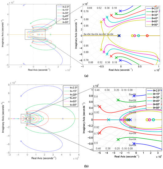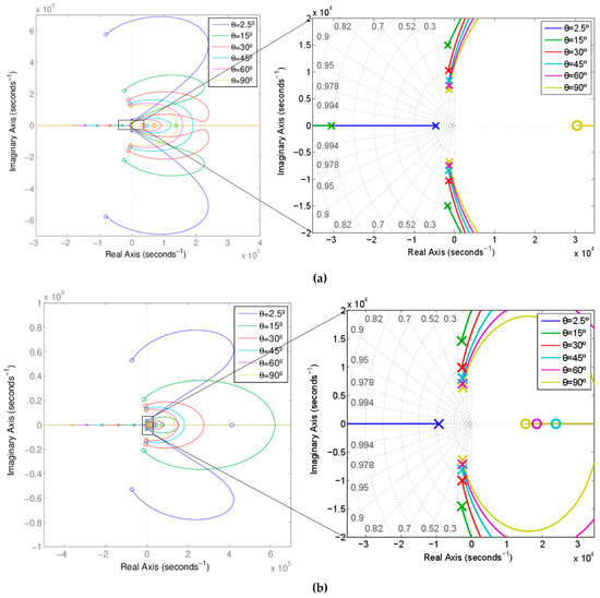 Root locus of (a) for 100 W, (R = 484 Ω, K1 = 16.67 A); (b) for 200 W, (R = 242 Ω, K1 = 33.33 A)