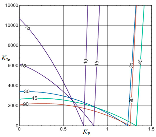 In a similar way to the previous case, the Routh–Hurwitz criterion is used to assure, at least, local stability in closed-loop. Once the Routh criterion is applied to the characteristic polynomial P(s) (Equation (30)), the corresponding stability constraints are given in Equation (31), and the kP-kIn chart is also obtained.