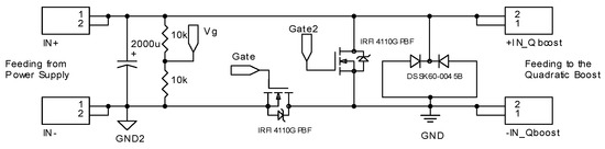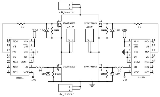 Several driver ICs are used: two IR2110 are used in the quadratic boost, two IR21834 are used in the unfolding stage, and a low-side only driver MCP1407P is employed in the buck-switch stage. The free-wheeling MOSFET of the buck-switch stage is driven by a complementary bipolar transistor pair (ZTX653/ZTX753), for the free-wheeling MOSFET. Figure 17, Figure 18, Figure 19 and Figure 20 depict the power stage circuits.