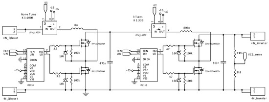 The following MOSFET transistors were selected: (a) the IRFB4110PBF (180 A, 100 V, 4 mΩ) for the Buck-switch cell, (b) the IPP110N20NA (88 A, 200 V, 9.9 mΩ) for the high-side and low-side switches of the first boost cell, (c) the SiC MOSFETs C3M0120090D (23 A, 900 V, 120 mΩ) for the second boost cell, and finally (d) for the unfolding stage switches, the SPW47N60C3 device (47 A, 650 V, 70 mΩ) was used.