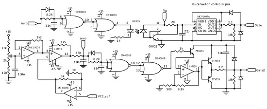 To implement the proposed sliding mode control surfaces, a hysteretic comparator is required. For practical reasons to be explained in Section 7, and related to the experimental results, two different type of hysteresis are available for test purposes: constant and variable. The inverter will be able to operate with any of them. The constant hysteresis width Δdc, can be adjusted in the range Δdc = [0.1,0.3]. In the variable hysteresis type Δ(t) = Δdc+Δv·|sin(θ)|, the offset Δdc and the amplitude Δv can be adjusted, where Δv = [0.1,0.5]. The hysteresis parameters have a considerable impact in the microinverter switching losses and conversion efficiency. Figure 21, Figure 22 and Figure 23 depict the control circuits.