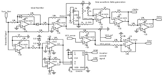 Figure 21 depicts diverse ancillary functions. Taking a sinusoidal signal from a function generator, this circuit board generates (a) the output voltage reference signal vref(θ) = |sin(θ)| by means of an ideal rectifier, (b) the output voltage error e(t) = vref(t)-vC2(t), (c) the unfolding-stage switching signals HIN2 and LIN2, and finally (d) both hysteresis widths, the constant one and the variable.
