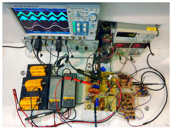The items displayed in Figure 24 are (1) the power supply SM70-45-D, (2) the buck-switch stage, (3) the two cascaded-boosts, (4) the ancillary and control PCBs, including both surfaces; (5) the unfolding stage; and finally the (6) load resistances (50–200 W). The oscilloscope, the function generator, and the power supply for the control boards are also shown.