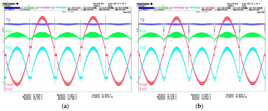 The input current iL1(t), depicted in light-green color, and the intermediate capacitor voltage vC1(t), in cyan color, show clearly the effect of the hysteresis type, as can be observed comparing the different ripple amplitudes in the left captions (sample mode). On the contrary, in the right side captions, where digital oscilloscope averaging is applied, the input current iL1(t) shows clearly a sin2(ωot) waveform type, whereas the vC1(t) exhibits a waveform of type |sin(ωot)|1/2, as expected from the state vector (Equation (6)) reproduced here in Equation (33).