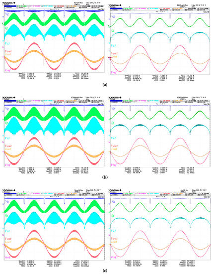 Microinverter captions at 100 W under different conditions. (a) Input current control and constant hysteresis. (b) Input current surface and variable hysteresis, and (c) self-oscillating surface and variable hysteresis.