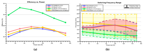 Microinverter results at different output powers, (a) efficiency, and (b) switching frequency.