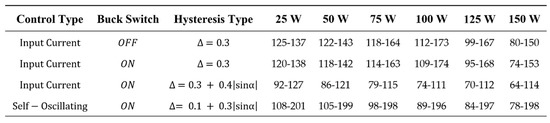 Figure 28 and Figure 29, Figure 30 and Figure 31 give, respectively, the inverter efficiency, and the minimum and maximum switching frequency, and the average switching frequency for diverse output powers P(W) = {25, 50, 75, 100, 125, 150}. Different control surfaces and hysteresis types are used. The input current surface with variable hysteresis exhibits the best efficiency, around 90%.