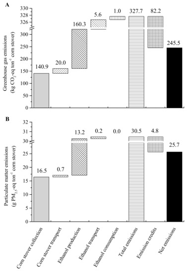 3.2. Life-Cycle GHG and PM2.5 Emissions for Corn Stover Based Ethanol