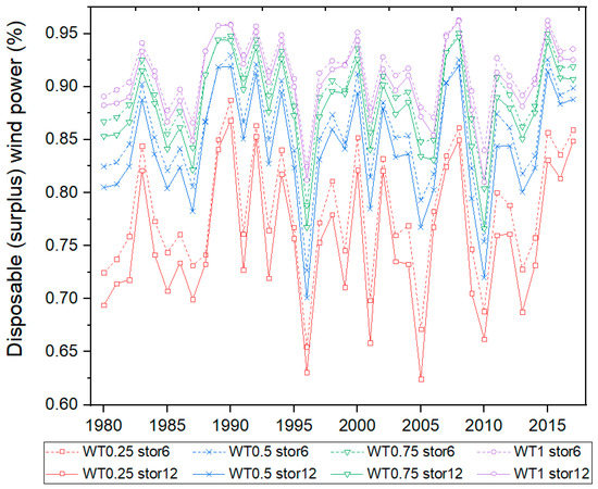 One of the most vital aspects of the economic and environmental performance of the proposed system is the amount of wind power curtailment. Assuming an off-grid wind farm operating solely for DH purposes and used as a peak heat source, produced wind energy may be utilised only if there is a need to charge thermal storage or the geothermal source is not capabe of covering the heating load alone. Thus, it is crucial to investigate what share of wind power would be curtailed. Analyses have been performed for more than 35 years using historical temperature and wind speed data. Results regarding excessive wind power production are shown in Figure 3 and Figure 4. It can be observed in Figure 3 that neither the size of the wind power nor heat storage strongly influenced the share of wind power curtailed during the investigated period of 35 years. Instead, the rate of curtailment mostly depended on the year considered. Power from the wind farm was not always produced in accordance with the heat demand—there were significant differences within the presented sequence of years. There were years in which an increase of storage capacity only slightly modified the share of surplus wind power in its total production (eg., 1989, 1995), whilst there were years for which this modification was evident (eg., 2005, 2011; best visible in the red set of lines).