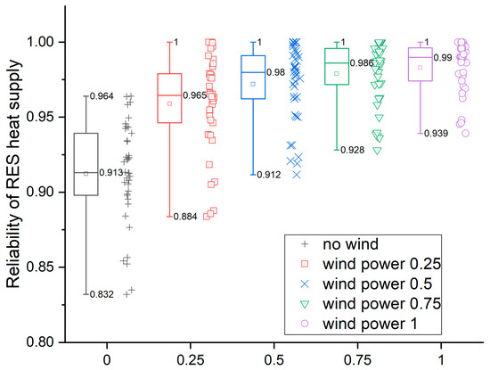 Figure 2 presents all acceptable solutions within the given constraints and for the heat storage equal to 96 units. A minimum amount of wind power was rejected when the geothermal heat source was small or none. However, most of such potential system configurations did not provide required RES reliability (minimum 95% for TMY) and were excluded. RES reliability of acceptable solutions is represented by the colour of the dot on top of each bar.