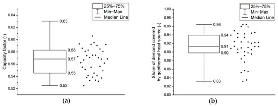 (a) Capacity factor for geothermal source and (b) share of energy demand satisfied by geothermal energy. The system consists of a geothermal heat source of 0.5 unit capacity, heat storage of 6 units capacity and wind power of any capacity.