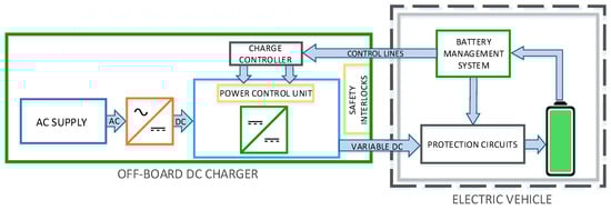 An alternative is the development of off-board chargers and the corresponding infrastructure that can mimic the functionality of a gasoline refueling station [14]. The off-board chargers are located outside the EV that can deliver the DC power to the EV battery through a power conditioning unit (PCU) as shown in Figure 2.