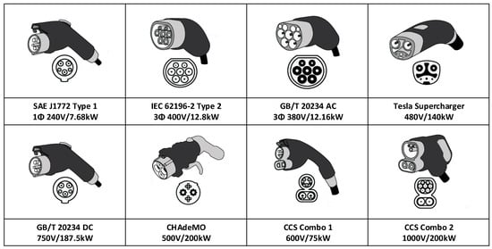 The batteries in EVs can be recharged through AC or DC chargers from the grid. Table 2 illustrates charging levels including slow, fast and extreme fast charging standards along with their ratings. Various connectors have been employed globally to enable these high charging rates. Figure 3 demonstrates the connectors currently used across the globe along with their power rating [10,11]. AC and DC fast charging techniques have been explained in the following sub-sections.