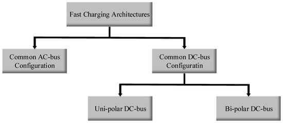 The design and configuration is crucial as the EV fast chargers should mimic the same infrastructure of gasoline refueling stations with a functionality of supplying multiple EVs. Therefore, two possible EV charging configurations are identified [36] and their classification is shown in Figure 5.