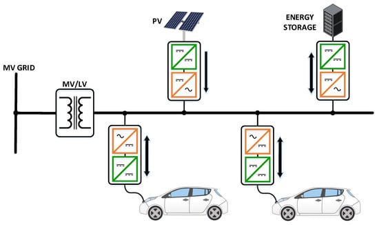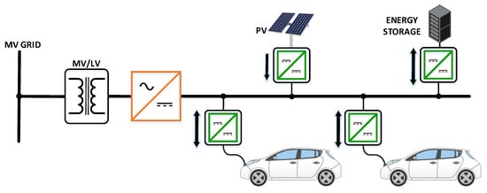 Alternatively, a single AC/DC stage with a higher power rating is used to form a common DC bus as shown in Figure 7. This structure is more flexible from the distributed sources point of view as these sources can be easily coupled with the DC bus using a local conversion stage at the distributed points. Another advantage of such a configuration is the elimination of synchronization issues and no reactive power exists. These salient features form an intelligent system that can work towards the stability of conventional utility grid [37]. Due to the elimination of many local conversion stages, the device count is less than the AC bus configuration, thus proving to be more economical. The overall efficiency of the system can also be improved because of the lesser power conversion stages. It is also beneficial especially under abnormal operation of the utility grid as it allows standalone operation in which the generated power is fed to the loads connected with the DC-bus [40]. However, the use of high power rectifier unit demands stringent grid requirements and impose on switching frequency limitation due to use of high power devices. Furthermore, it demands complex protection devices compared to the AC bus configuration due to the absence of zero crossing points [41]. The common DC-bus configuration is further classified as unipolar and bipolar dc bus [42]. Various significant research has been carried out in terms of innovative central active front end (AFE) converter topologies including dual two-level voltage source inverter (VSI) [43], single DC-link H-bridge converter [44], Vienna rectifier [45], multipulse rectifier with DC active power filter [15], three-level neutral point clamped converter [42], matrix front-end converter [46,47] and cascaded H-bridge converter [42,48]. The comparison of different charging station topologies are analyzed in Reference [49]. The two popular control schemes such as voltage oriented control (VOC) [50] and direct power control (DPC) [51] are used to control these converters in order to maintain power factor, bi-directional power flow and harmonic reduction. The summary comparison between the AC and DC coupled systems are listed in Table 4.
