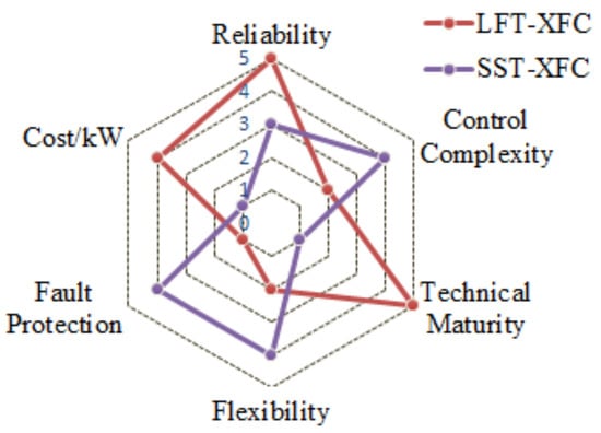 Some early SST-based XFCs have been reported and a team at the North Carolina State University demonstrated 50 kW SST-based MV modular fast charger [17] of output voltage range of 200–500 V to charge the battery. This charger is powered by the 2.4 kV single-phase distribution line and utilizes SiC devices [55]. This developed system is able to achieve thirty times the reduction in volume and half the power losses in comparison to the existing system. Several studies are going on to extend this concept for the multi-mega watt SST based XFCs with estimated increase in efficiency of 5%. A list of key characteristics for comparison between LFT and SST-based XFCs is shown in Figure 9. As the power converters are connected to the MV line, series connection at the input and parallel connection of the out stages are recommended. Various AFE power converter topologies have been studied [49], among them cascaded H-bridge [56] and modular multilevel converters [13,57] are becoming popular. The SST-based XFCs are beneficial to both EV users and charging station owners with increased efficiency and smaller foot print. It provides faster charging, high availability and cheaper charging to EV users whereas it reduces installation cost and enhances the utilization of resources [58]. For instance, fast charger installation demands concentrate foundation for both LF transformer and charger in seismically active areas. The presented SST-based XFC able to reduced cost to 40% of the conventional 50 kW charging systems [17].